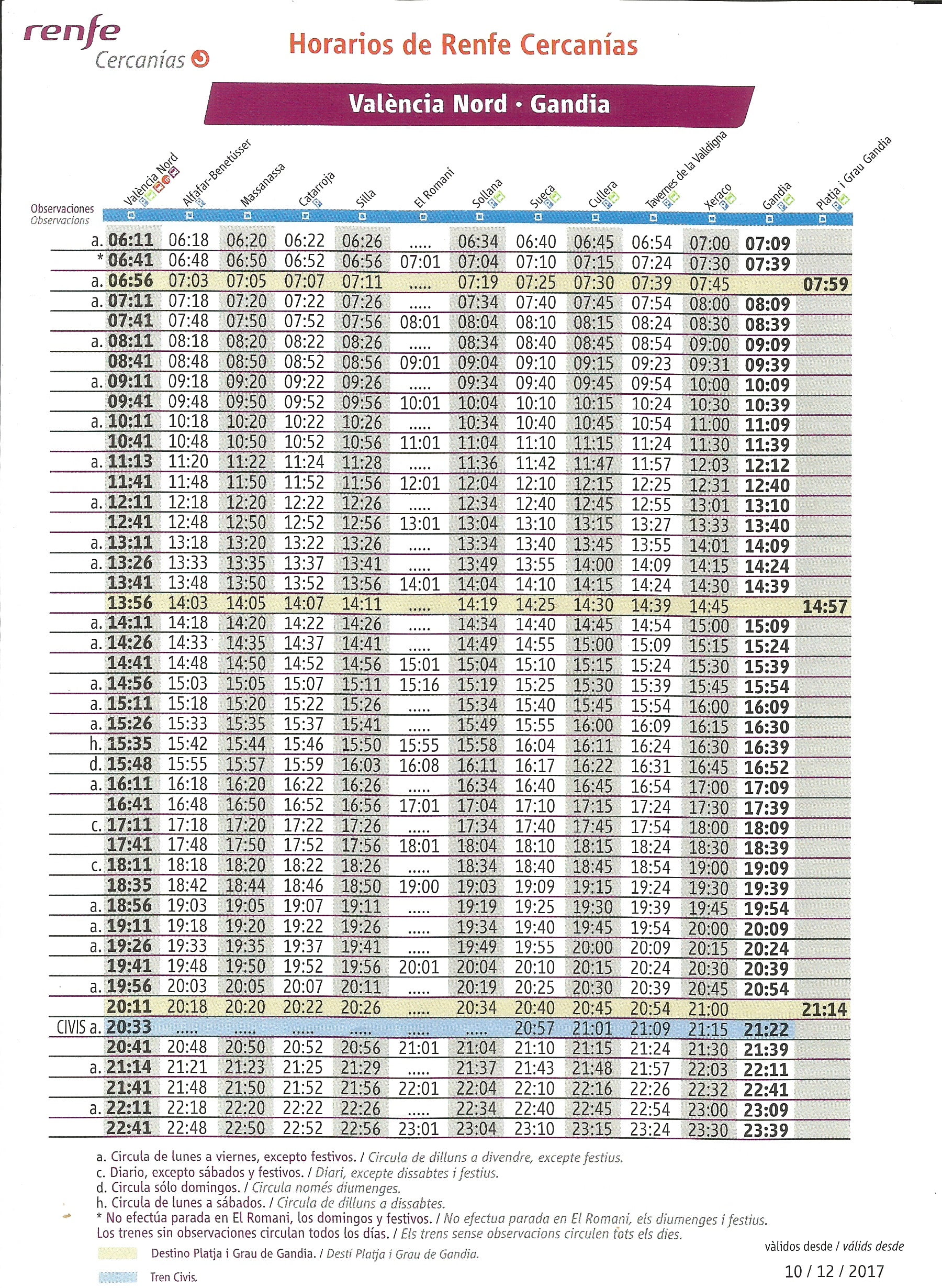 Valencia to Gandia Train Timetable 2018 Discover Spain's Costa Blanca & Valencia Posted on 18 February 2018 by VCB Team18 February 2018 Valencia to Gandia Train Timetable 2018Here is a copy of the train timetable for Valencia Nord to Gandia for 2018Gandia to Valencia Train Timetable 2018 (click to enlarge) Share Messenger Post Whatsapp reddit
